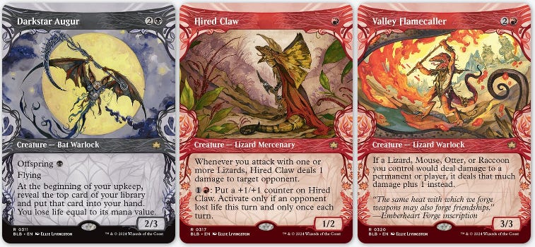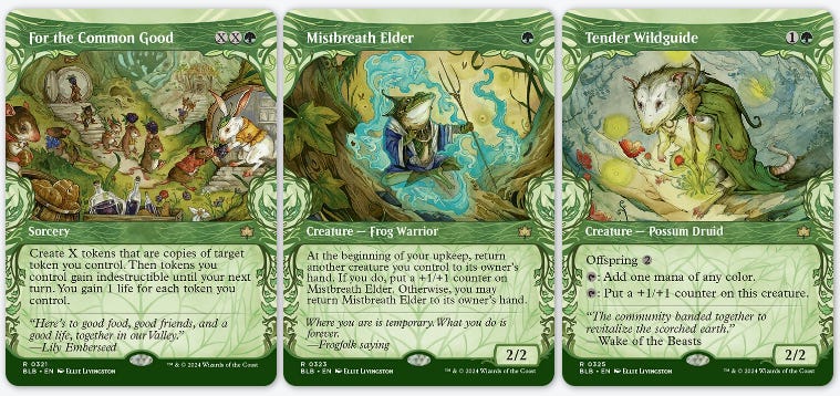 DC: Let’s talk about your cards! You had six cards released during Bloomburrow, all as a part of the Woodland Showcase. Let’s go lightning round style, quick like a bunny.