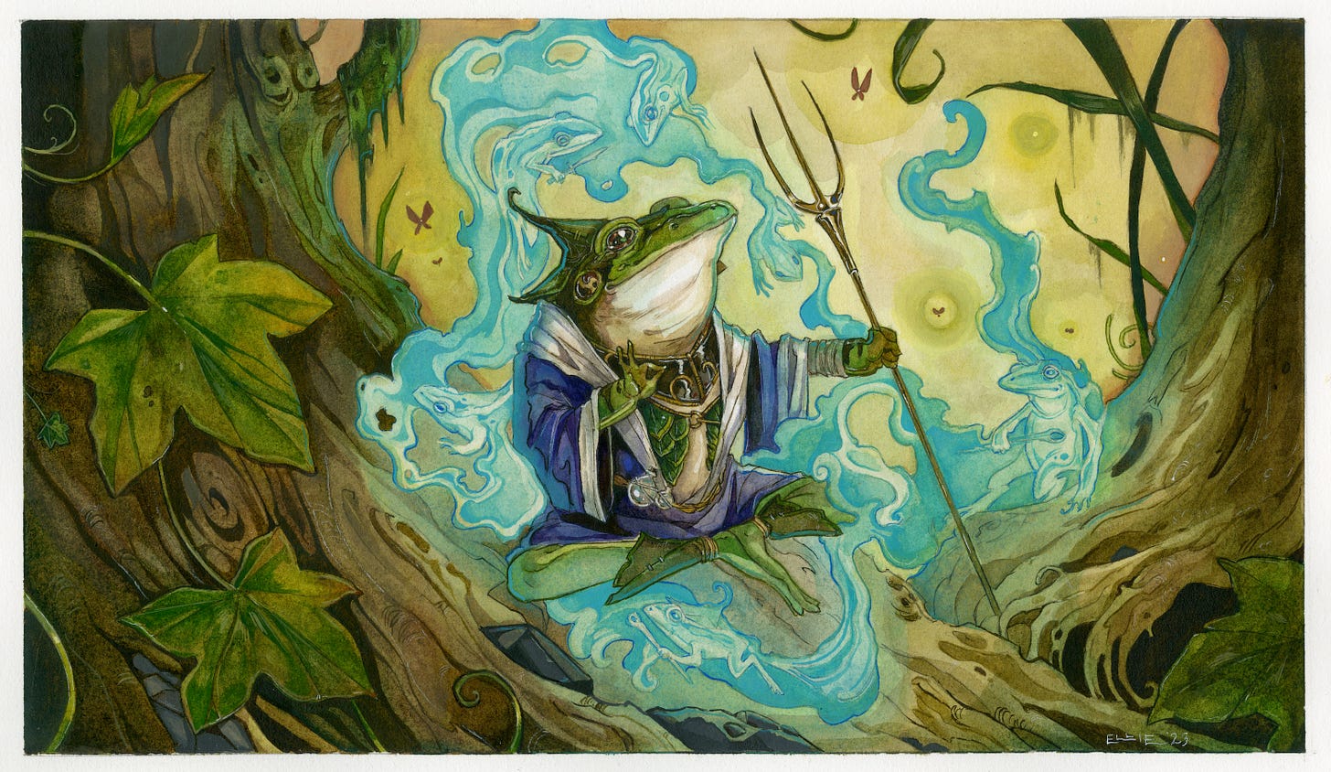EL: Well I don’t know if you can tell but he’s supposed to be summoning the strength of his froggy ancestors! Look closely at the art and you’ll see that the blue swirl is made up of other little frog wizards!